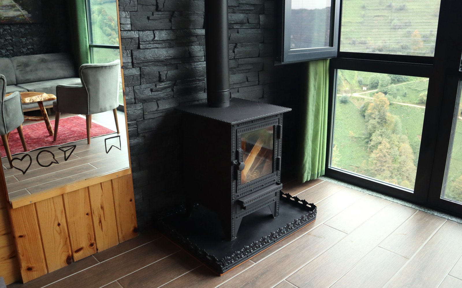 Şömine, klima ve merkezi ısıtma sistemiyle dört mevsim rahatlık sağlar.